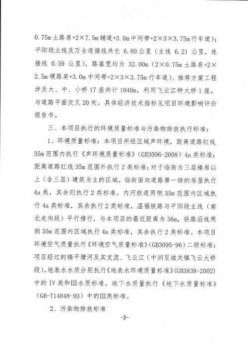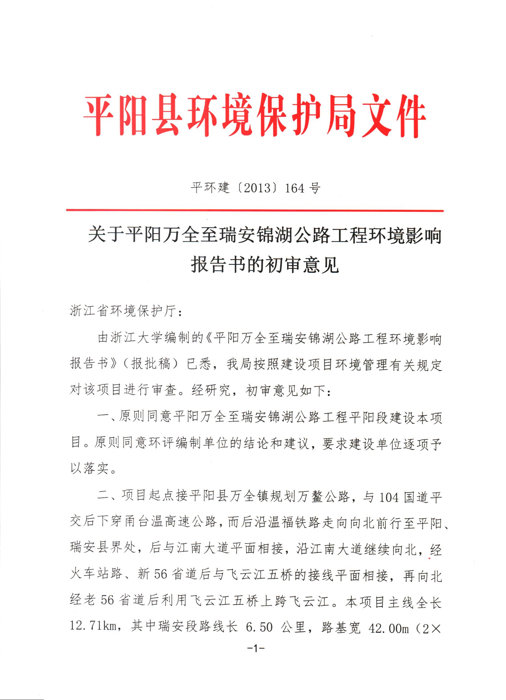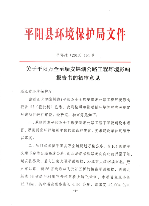 關于平陽萬全至瑞安錦湖公路工程環境影響報告書的初審意見