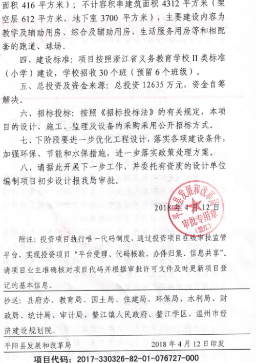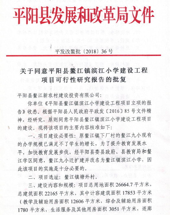 關(guān)于同意平陽縣鰲江鎮(zhèn)濱江小學(xué)建設(shè)工程項(xiàng)目可行性研究報(bào)告的批復(fù)