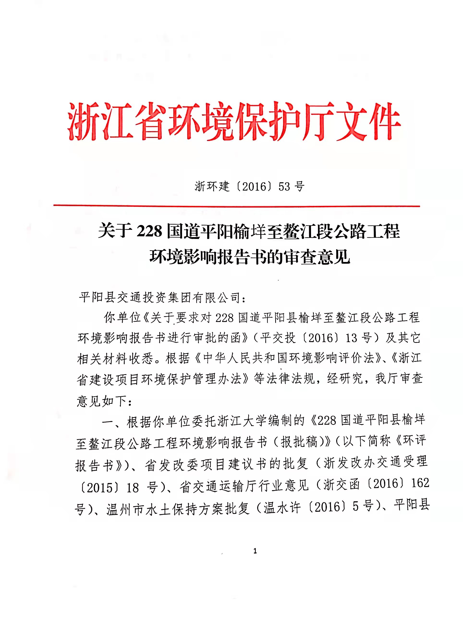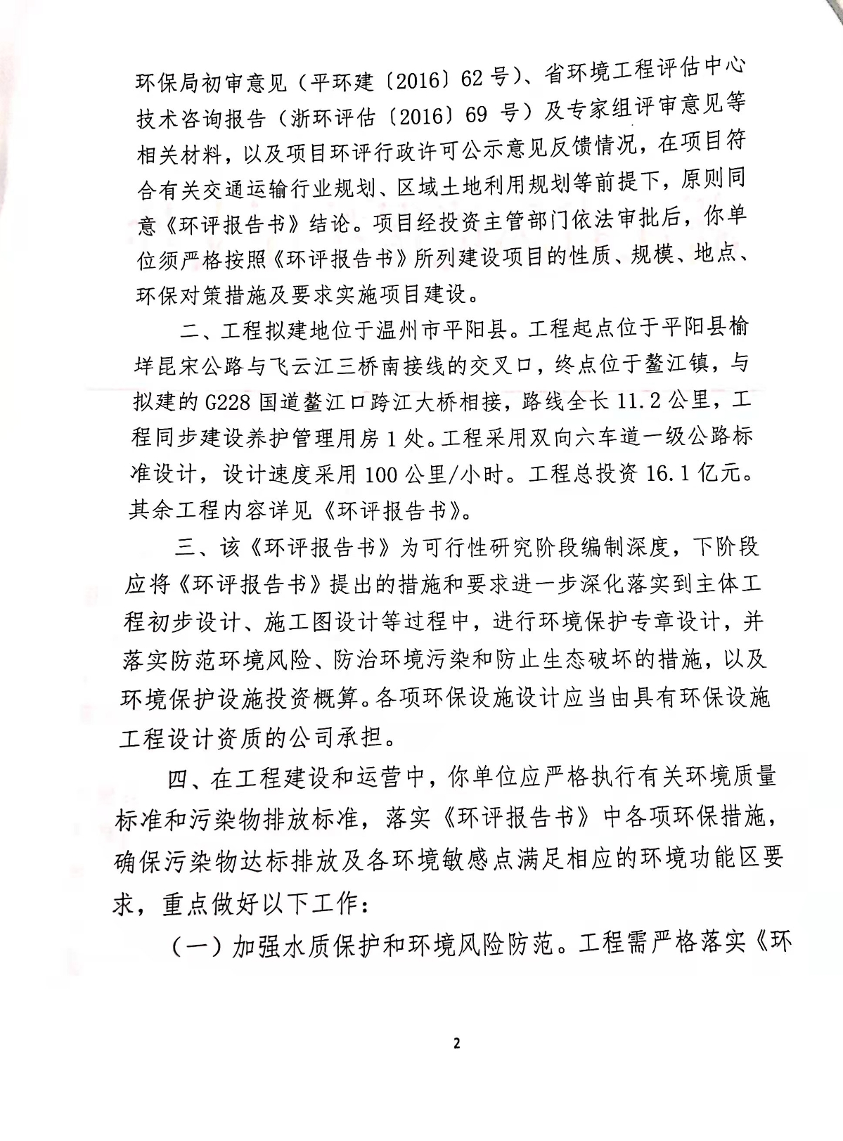 關于228國道平陽榆垟至鰲江段公路工程環境影響報告書的審查意見