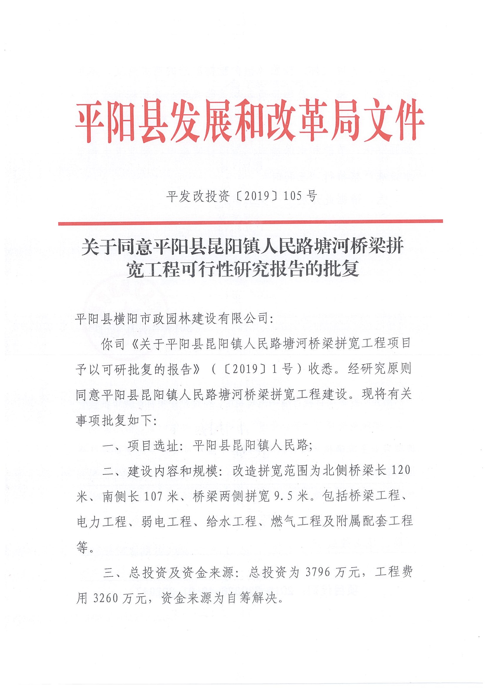 關于同意平陽縣昆陽鎮人民路塘河橋梁拼寬工程可行性研究報告的批復
