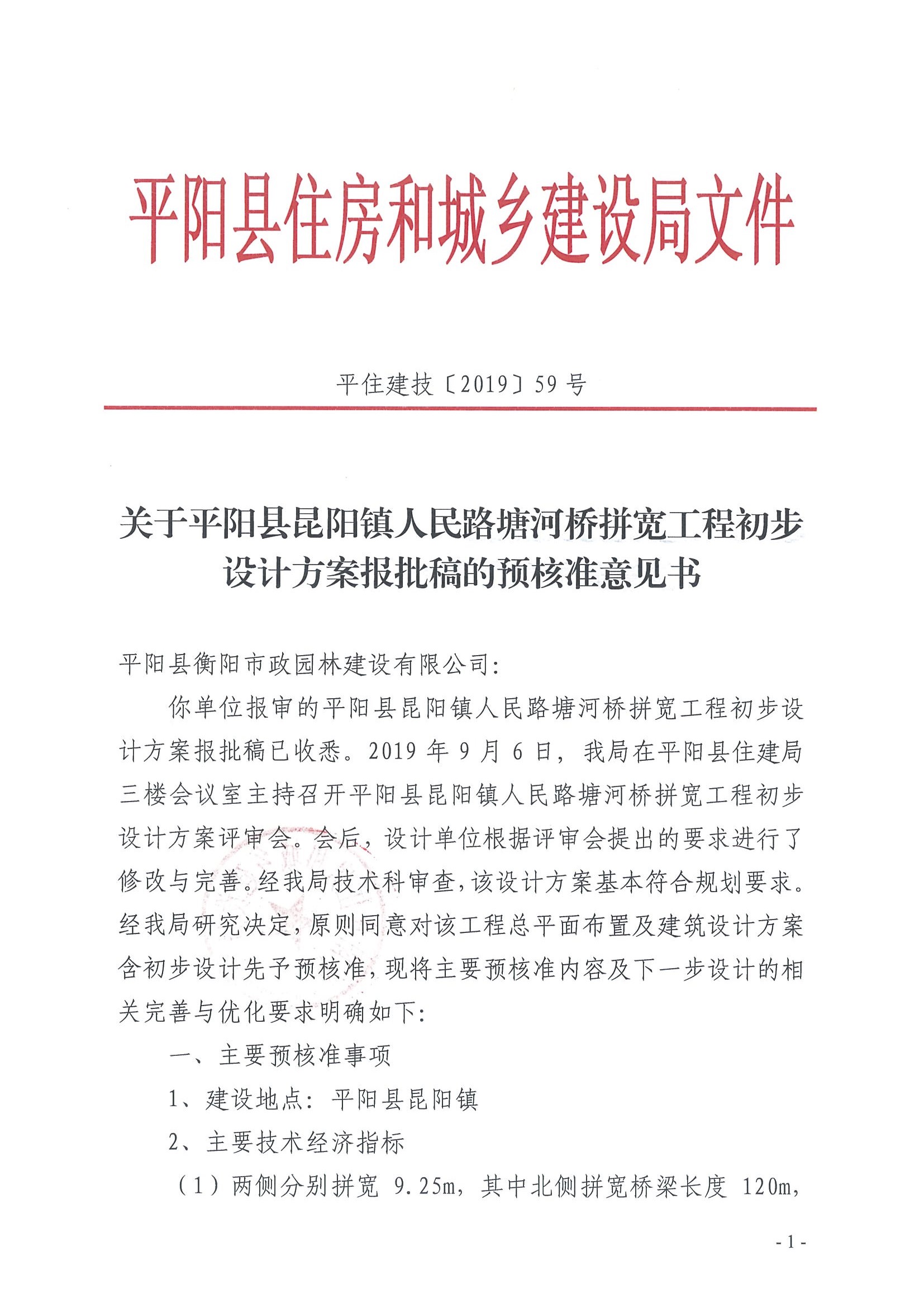 關(guān)于平陽縣昆陽鎮(zhèn)人民路塘河橋拼寬工程初步設(shè)計方案報批稿的預(yù)核準(zhǔn)意見書