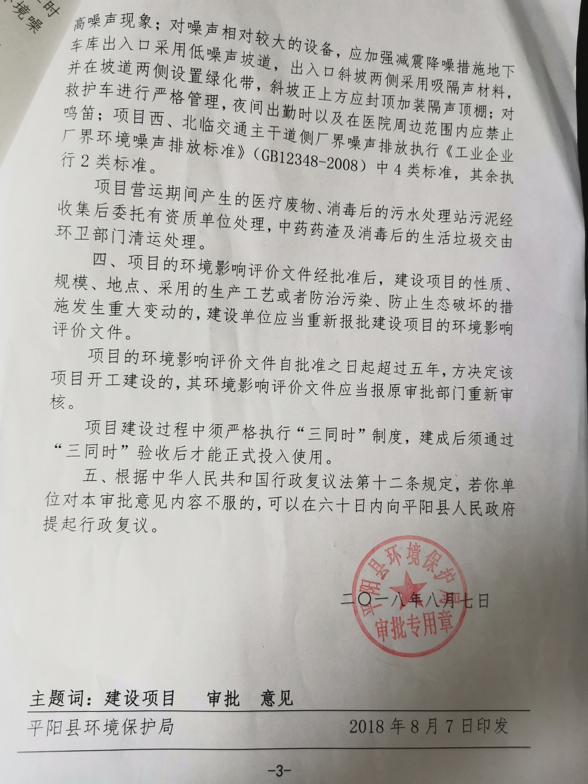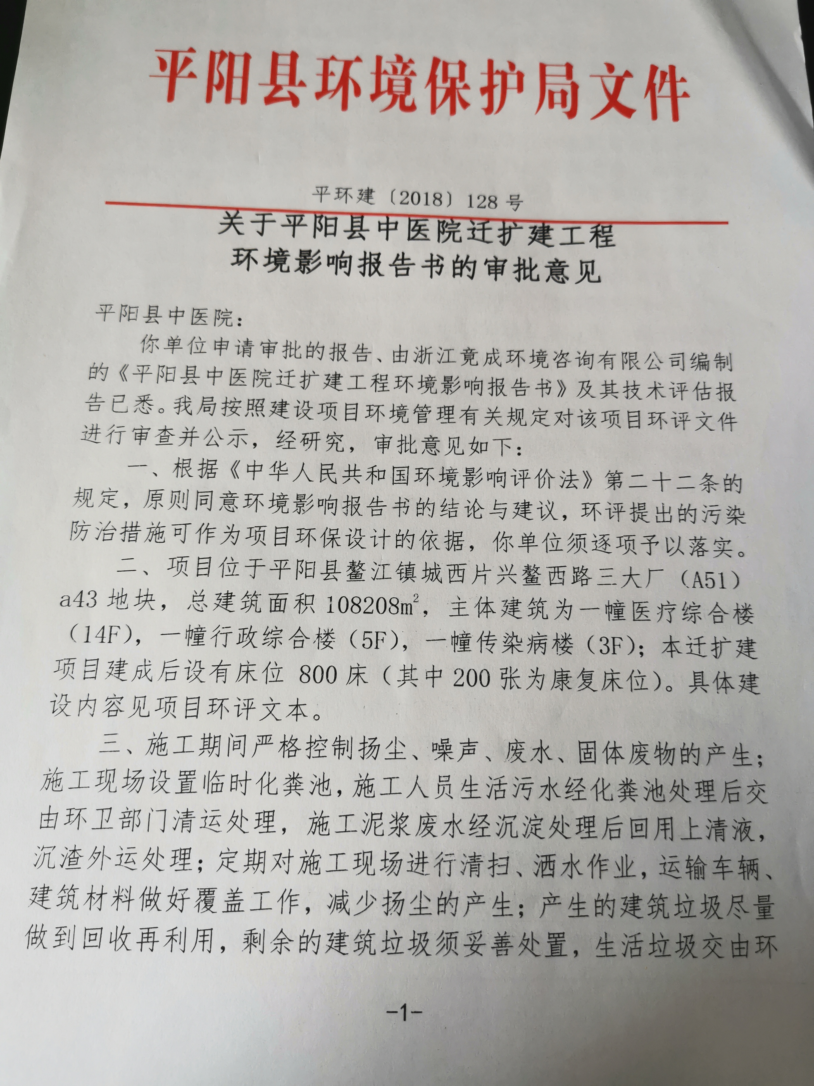 平陽縣中醫院遷擴建工程環境影響報告書的審批意見