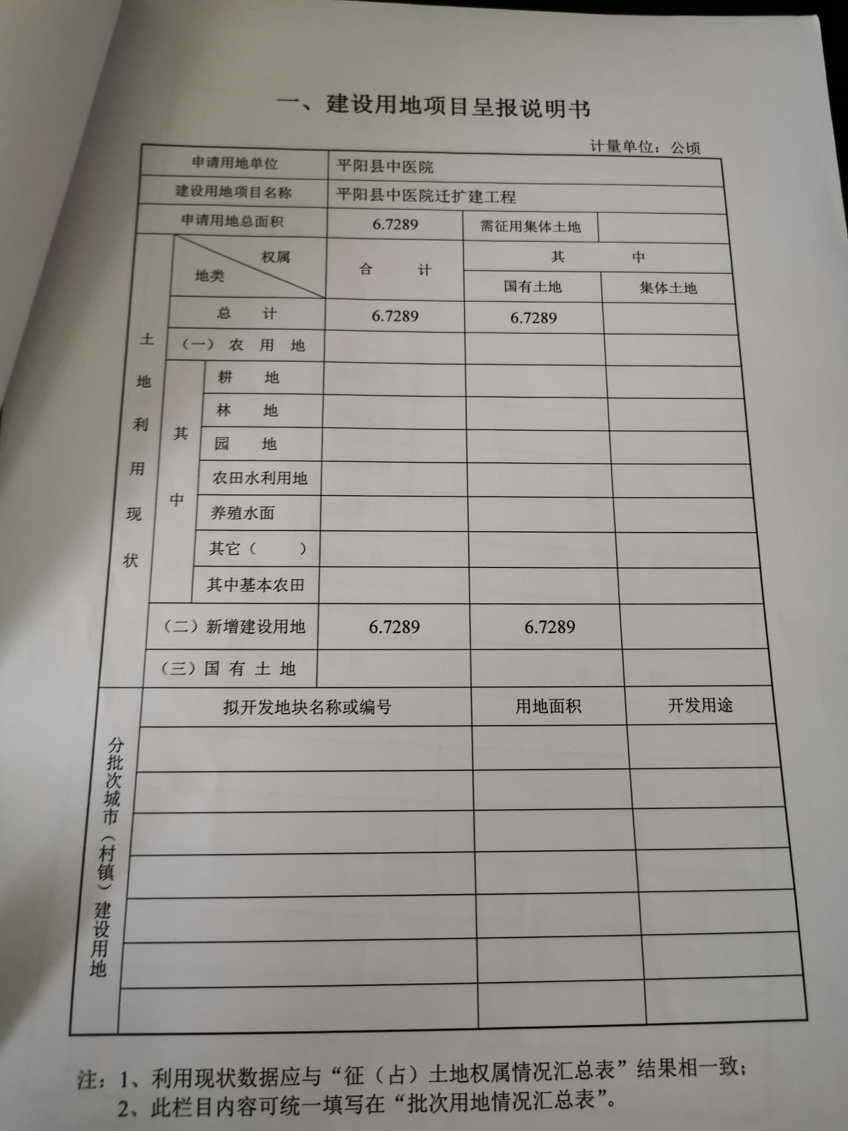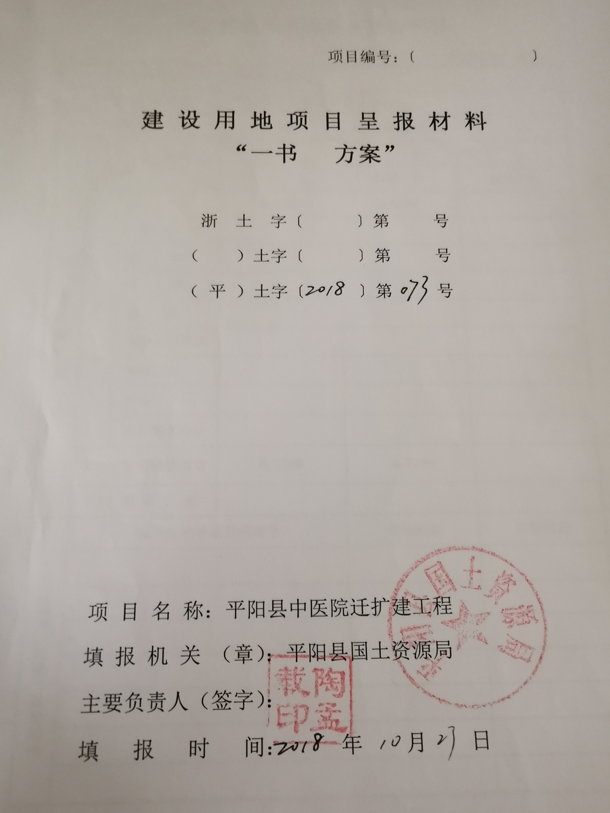 平陽縣中醫院遷擴建工程項目建設用地項目呈報材料“一書”方案(平土字[2018]073號)