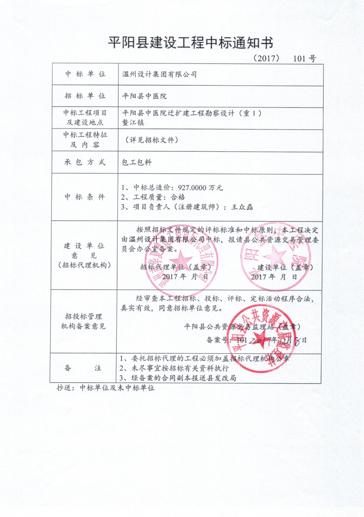 平陽縣中醫院遷擴建工程項目中標通知書(設計)