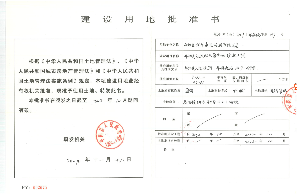 平陽(yáng)縣機(jī)關(guān)幼兒園用地批準(zhǔn)書