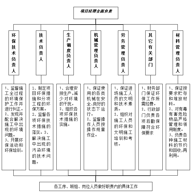1.1.1.?環境保護責任保證體系 施工期間,棄土及施工材料的運輸、施工機械的工作將給城市的大氣環境、聲環境帶來影響。我公司將遵循“以人為本”的原則,以最大限度地減少施工活動給周圍群眾造成的不利影響。同時,我們將嚴格遵守國家、省、市有關環境保護的規定。在實施ISO9001質量體系時,建立健全的施工環境管理制度和管理體系,實現施工環境管理的系統化、標準化。