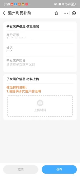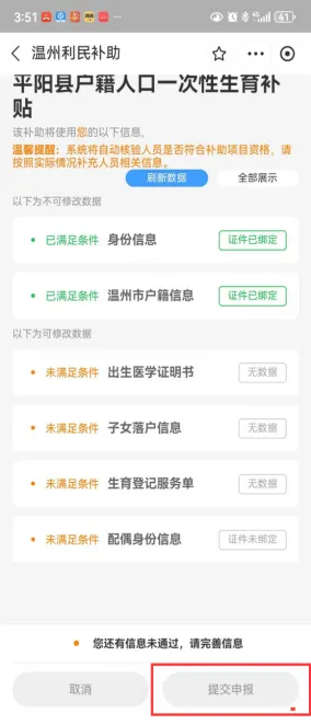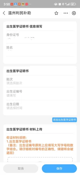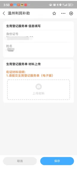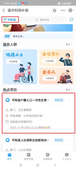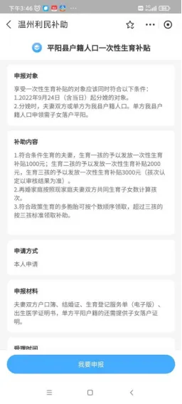 補貼對象 享受一次性生育補貼的對象應該同時符合以下條件: 1.2022年9月24日(含當日)起分娩的對象。 2.分娩時,夫妻雙方或單方為我縣戶籍人口。單方我縣戶籍人口申領需子女落戶平陽。 補貼標準 1.符合條件生育的夫妻,生育一孩的予以發放一次性生育補貼1000元;生育二孩的發放一次性生育補貼2000元,生育三孩的發放一次性生育補貼3000元(孩次認定以審核結果為準)。 2.再婚家庭按照現家庭夫妻雙方共同生育子女數計算孩次。 3.符合政策生育的多胞胎可按個數順序領取,超過三孩的按三孩標準領取補助。 4.如果是雙胞胎,也只需要申請一次,在上述資料基礎上,填寫兩個孩子出生醫學證明編號并上傳該兩個孩子的出生醫學證明書,金額疊加。 補貼發放流程 符合條件的夫妻應自分娩之日起1年內(2022年9月24日至本辦法印發之日期間分娩的對象,補貼申領時間自本辦法印發之日起1年內),通過浙里辦APP上的溫州市利民補助一鍵達在線申請, 雙方均為平陽縣戶籍的由一方提出申請(一個子女僅能由夫妻任一方申請一次,不能重復申請),單方為平陽縣戶籍的由平陽縣戶籍的一方提出申請。 對象需提供夫妻雙方身份證、戶口本、結婚證、生育登記服務單(電子版)、出生醫學證明書、申請人市民卡,單方平陽縣戶籍的還需提供子女落戶證明。 申請流程如下: 【通過浙里辦登錄/免費注冊】→【選擇地區】→【選中對應的補助項目】→【完善信息和材料】→【確認申報】→【申報成功,關注申報進展】 1、進入浙里辦尋找對應服務