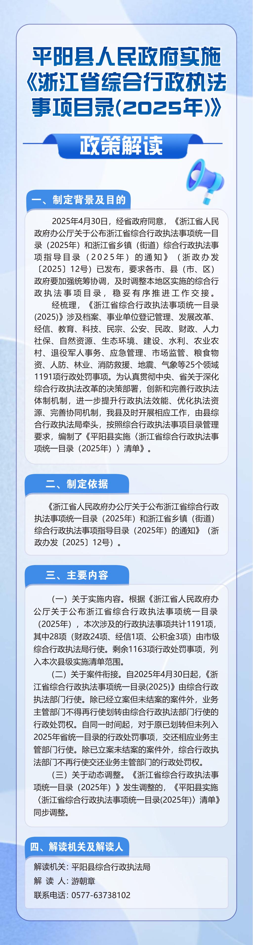 平陽縣人民政府實施《浙江省綜合行政執法事項目錄(2025年)》的政策解讀 一、制定背景及目的 2025年4月30日,經省政府同意,《浙江省人民政府辦公廳關于公布浙江省綜合行政執法事項統一目錄(2025年)和浙江省鄉鎮(街道)綜合行政執法事項指導目錄(2025年)的通知》(浙政辦發〔2025〕12號)已發布,要求各市、縣(市、區)政府要加強統籌協調,及時調整本地區實施的綜合行政執法事項目錄,穩妥有序推進工作交接。 經梳理,《浙江省綜合行政執法事項統一目錄(2025)》涉及檔案、事業單位登記管理、發展改革、經信、教育、科技、民宗、公安、民政、財政、人力社保、自然資源、生態環境、建設、水利、農業農村、退役軍人事務、應急管理、市場監管、糧食物資、人防、林業、消防救援、地震、氣象等25個領域1191項行政處罰事項。為認真貫徹中央、省關于深化綜合行政執法改革的決策部署,創新和完善行政執法體制機制,進一步提升行政執法效能、優化執法資源、完善協同機制,我縣及時開展相應工作,由縣綜合行政執法局牽頭,按照綜合行政執法事項目錄管理要求,編制了《平陽縣實施〈浙江省綜合行政執法事項統一目錄(2025年)〉清單》。 二、制定依據 《浙江省人民政府辦公廳關于公布浙江省綜合行政執法事項統一目錄(2025年)和浙江省鄉鎮(街道)綜合行政執法事項指導目錄(2025年)的通知》(浙政辦發〔2025〕12號)。 三、主要內容 (一)關于實施內容。根據《浙江省人民政府辦公廳關于公布浙江省綜合行政執法事項統一目錄(2025年),本次涉及的行政執法事項共計1191項,其中28項(財政24項、經信1項、公積金3項)由市級綜合行政執法局行使。剩余1163項行政處罰事項,列入本次縣級實施清單范圍。 (二)關于案件銜接。自2025年4月30日起,《浙江省綜合行政執法事項統一目錄(2025)》由綜合行政執法部門行使。除已經立案但未結案的案件外,業務主管部門不得再行使劃轉由綜合行政執法部門行使的行政處罰權。自同一時間起,對于原已劃轉但未列入2025年省統一目錄的行政處罰事項,交還相應業務主管部門行使。除已立案未結案的案件外,綜合行政執法部門不再行使交還業務主管部門的行政處罰權。 (三)關于動態調整。《浙江省綜合行政執法事項統一目錄(2025年)》發生調整的,《平陽縣實施〈浙江省綜合行政執法事項統一目錄(2025年)〉清單》同步調整。 四、解讀機關及解讀人 解讀機關:平陽縣綜合行政執法局 解讀人:游朝章 聯系電話:0577-63738102 |